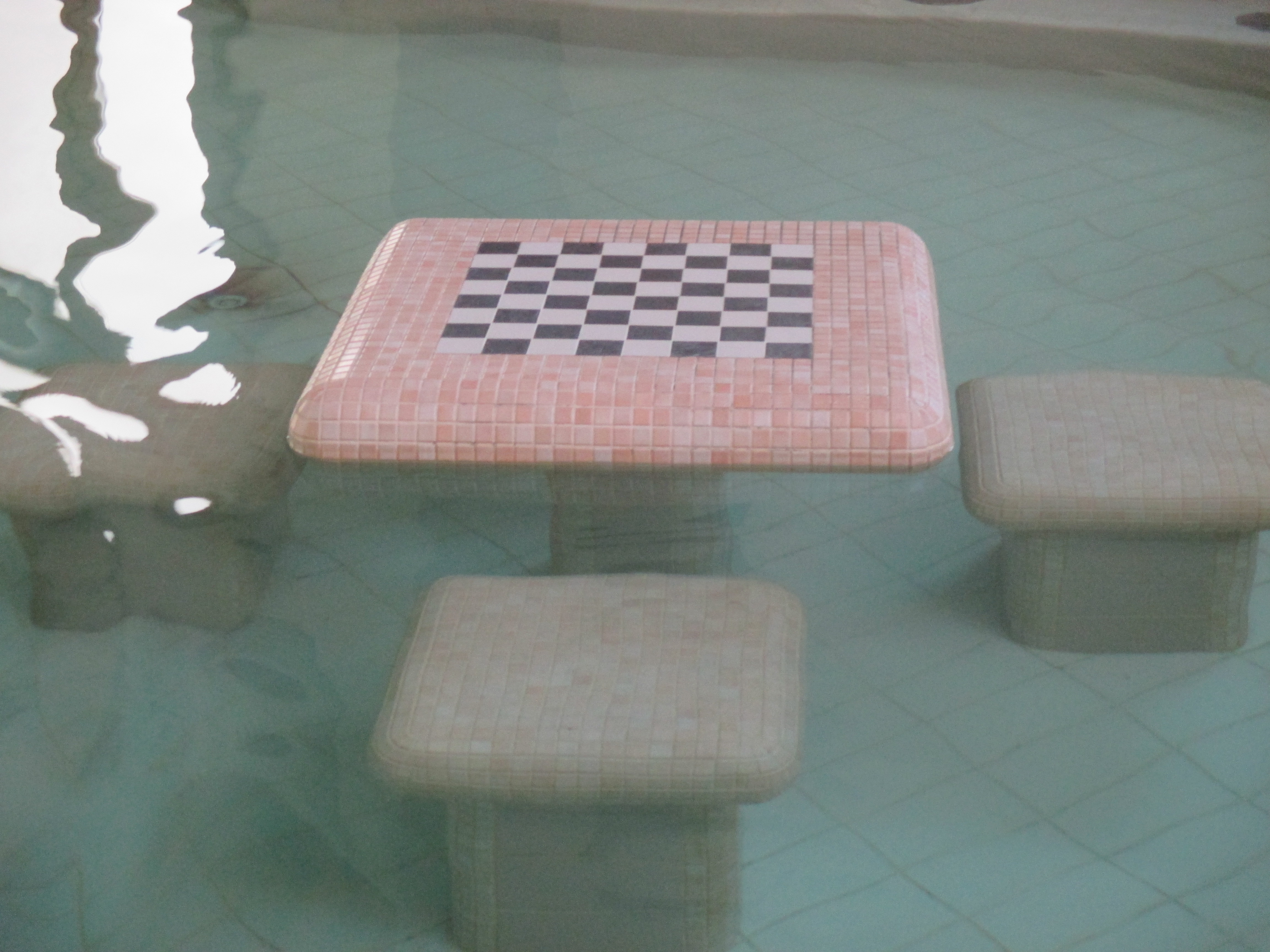 Nakon što se popnete opet gore, sa desne strane ćete proći kroz vrata i pravo videti ulaz u centralni deo sa bazenima. Tu imate 3 bazena i temperatura je mislim negde oko 28-30 stepeni. Voda jeste topla, ali ne preterano i po izlasku imate utisak da nosite okove na nogama. U jednom od bazena se nalazi neka kao pećina u kojoj su na plafonu reflektori koji menjaju boje, pa to bude zanimljivo. Povremeno se uključuju i slapovi. U drugom bazenu imate đakuzi i fantastičan je osećaj kad legnete na prskalice i prepustite se kompletnoj vibrirajućoj masaži tela. Ko ne voli đakuzi, može da odigra partiju šaha u vodi. Videćete dva stola sa šahovskom tablom i dve stolice u tom istom bazenu.Treći bazen je zanimljiv jer se nastavlja u jedan manji da tako kažem. U tom manjem i užem delu se povremeno uključuju veštački virovi, kako sam ih ja prozvala, pa to baš bude zabavno. Voda vas nosi u krug sve većom brzinom i teško da ćete se izvući dok se to ne isključi.