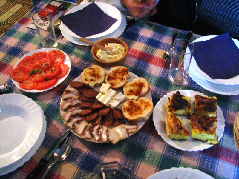 Kada smo se smestili i malo zgrejali, počelo se sa posluživanjem. Prvo predjelo, sa onim divnim kajmakom, hlebom sa mašću i alevom paprikom, ukusnim prerađjevinama od mangulice, potom odlična gibanica. Posle toga naravno, usledilo je i glavno jelo u vidu slasnog gulaša od mangulice sa krompirom i kupus salatom. Uostalom, slika govori više od hiljadu reci, a najbolje je da odete na lice mesta i sami se uverite u ono o čemu pričam. Kako to obično biva u krčmama, kada se popije po koja čašica i stomak se malo zagreje i napuni, usledi pesma i svirači.