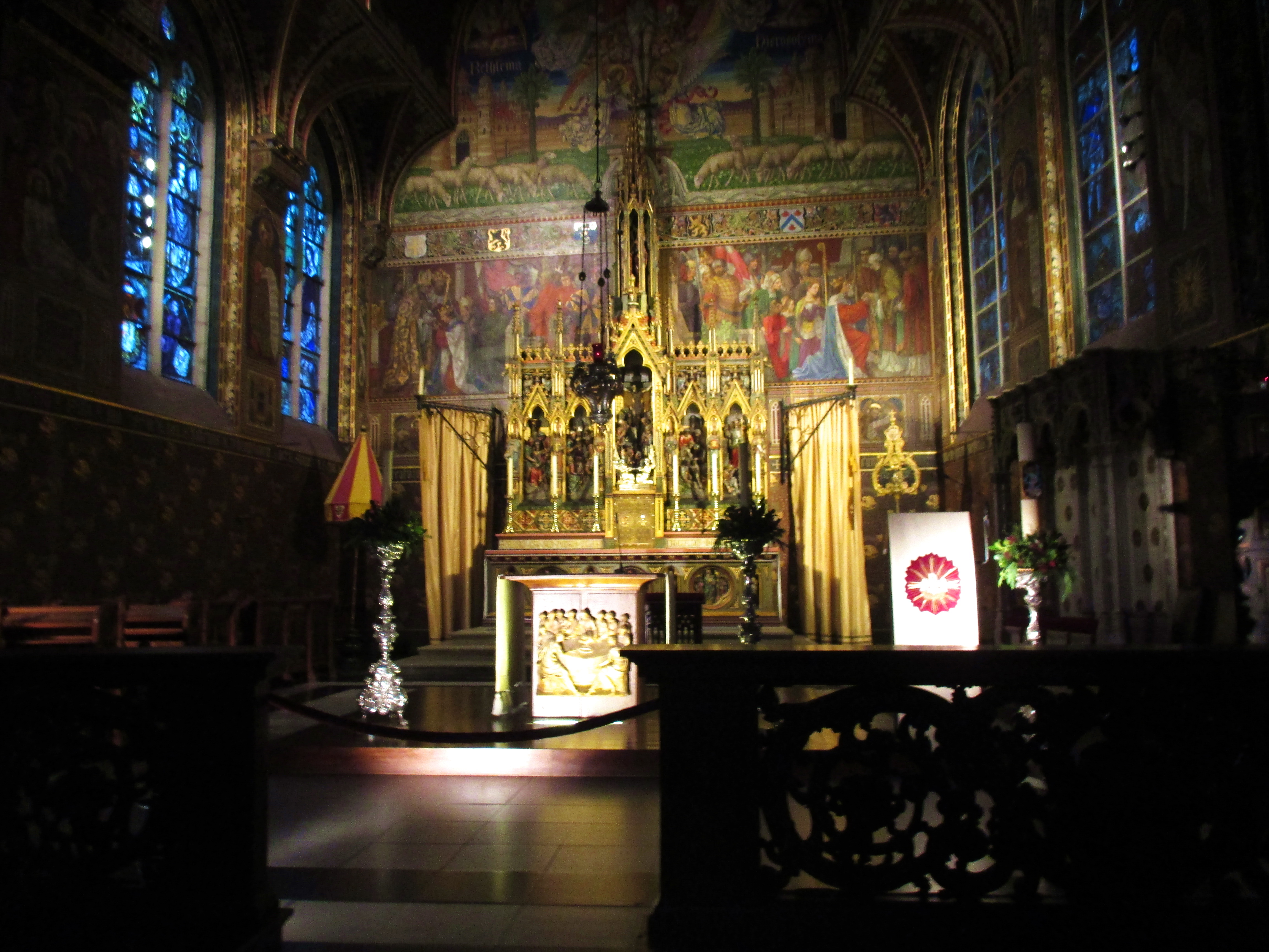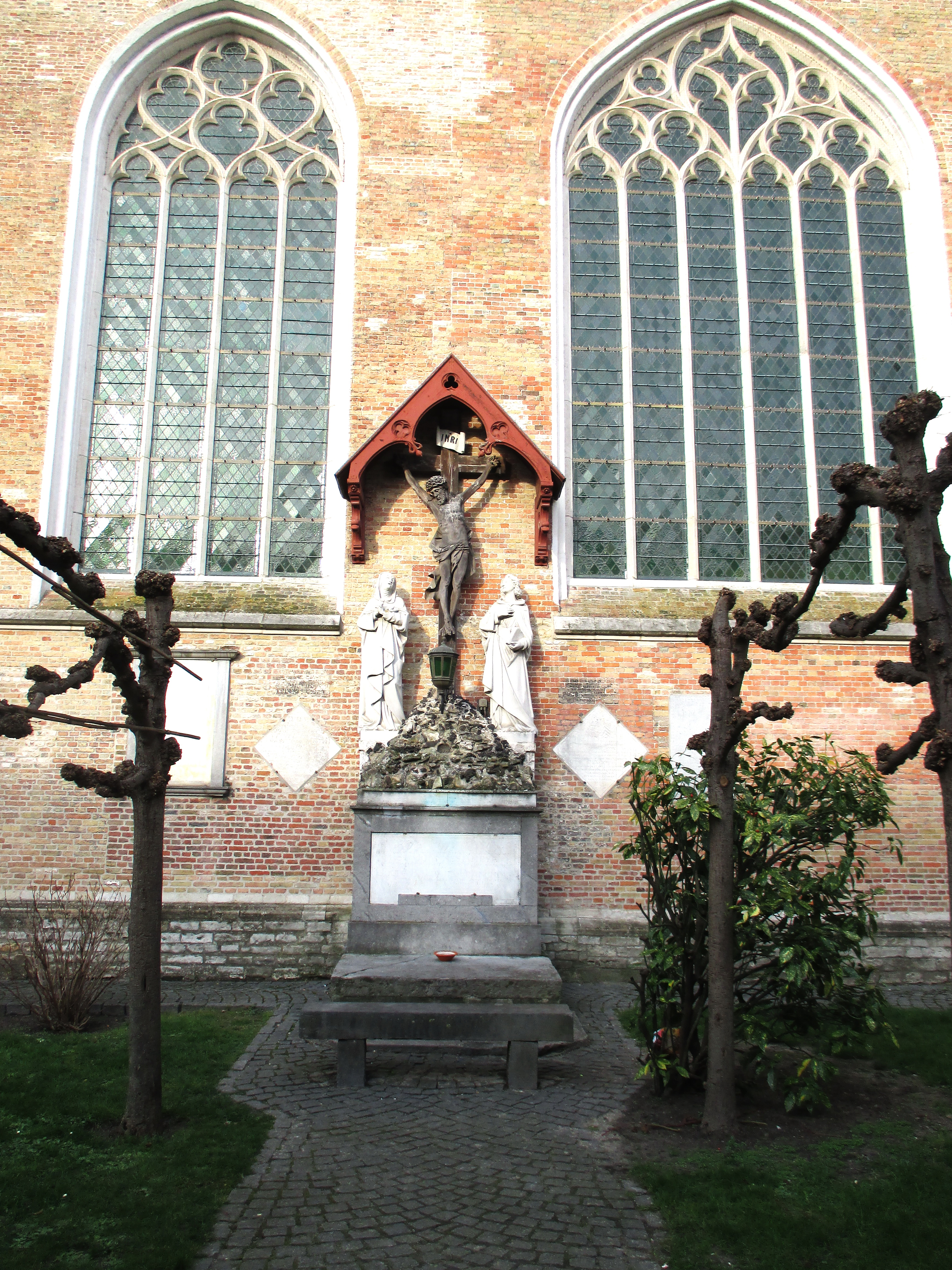 Sledeća bitna znamenitost jeste Bazilika Sv krvi. Ovu baziliku smo imali prilike da posetimo. Ona sadrži dva nivoa i privlači pilgrime i turiste najviše zbog toga što se u njoj čuva bočica u kojoj se navodno nalazi Hristova krv. Kapela u prizemlju je u romanesknom stilu i građena je 1150. godine, dok je druga kapela u gotičkom stilu i raskošnija, sa prelepim muralima i prozorima sa oslikanim staklom. Prija vam da se posle vetrovitog dana sakrijete u tako neko toplo mesto i malo odmarate u miru. Ovu drugu kapelu je uništila francuska vojska u XVIII veku, pa je kasnije rekonstruisana. Što se Svetog grala tiče, on je donet iz Jerusalima 1150.godine, prema jednom izvoru, a prema nekim drugim izvorima, iz Konstantinopolja 1204. godine, nakon Četvrtog krstaškog rata. Mislim da se bočica nalazi na spratu i da košta nekih 2 evra da se uđe u taj muzejski deo, gde ima još nekih postavki i predmeta.