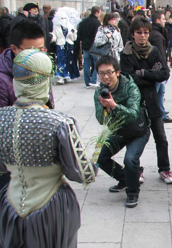 Maskirane glumce koje angažuje opština za tu priliku, odmah opkole fotografi.Svako hoće da uhvati najbolji ugao za slikanje i da napravi nabolju fotografiju.I taman kad pomisliš… uf super… to je to… škljoc, udje ti nečija ogromna glava u fokus i nesta čarolija.Dakle, treba strpljenja i upornosti, a bogami i snalažljivosti i prodornosti, inače ćeš se vratiti kući samo sa mnoštvom turističkih glava na fotografijama, a od kostima ni traga.Te gužve su, doduše, karakteristične za nedelju, dan zvaničnog otvaranja karnevala dogadjajem koji se zove „Let andjela“. Ponedeljkom je već znatno prijatnije na temu gužve.