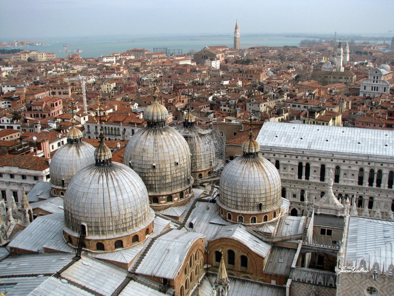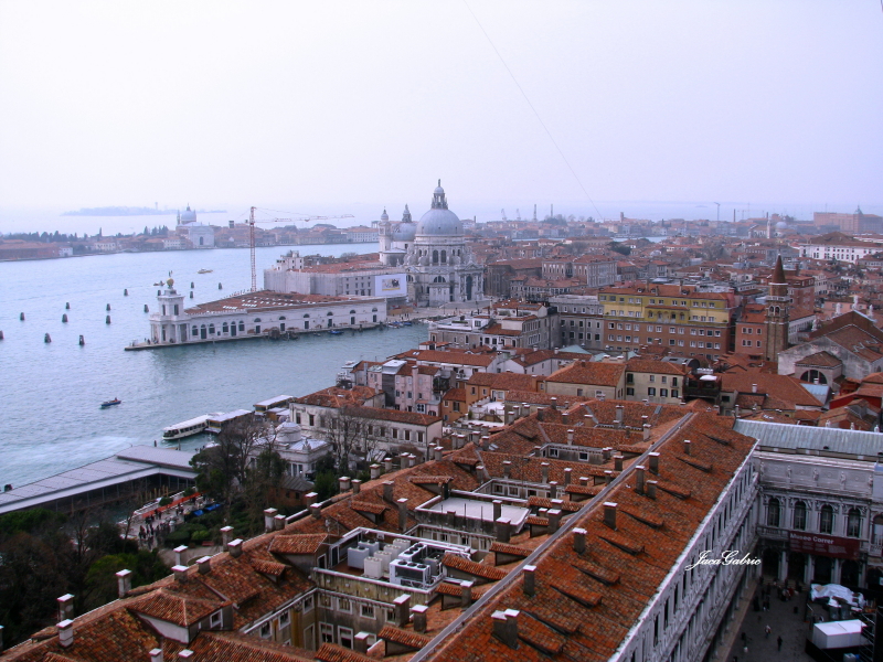 Danas je znantno prijatnije i vreme i kretanje. Osetno je manje ljudi.Pokušavamo da stanemo u red za Campanile (Zvonik crkve svetog Marka) odakle se pruža fantastičan pogled na celu Veneciju. Za 8 evra po osobi i pola sata čekanja, stižemo konačno do lifta koji nas za samo nekoliko sekundi vozi na visinu od 98 metara.Uf, sto duva gore, Nina mora da skine svoju masku sa perjem. Ljudi, koji pogled ! Bellissimo, nestvarno lepo, da li ja to sanjam ? Ček da se uštinem ! Koja lepota !!! Fotografije to ipak ne mogu da dočaraju u toj meri. Da ne bi onog vetra ne bi ni silazila odozgo. Ostala bi, sto reče Gete kada je 1786. duže boravio u Veneciji, sve dok se ne nagledam te lepote. Tamo je Crkva Santa Maria della Salute obasjana suncem, podignuta posle epidemije kuge kao zaštitnica zdravlja Venecijanaca. Gondole klize kao dečije igračke po moru i kanalima, jata golubova preleću nebo, kupole crkve svetog Marka, Duždeva palata, Trg sv,Marka sa crnim tačkicama od ljudi, crveni krovovi …Pitam se da li su stanovnici Venecije svesni lepote u kojoj žive, ili su već navikli oko, pa je ni ne primecuju više kao mi turisti ?