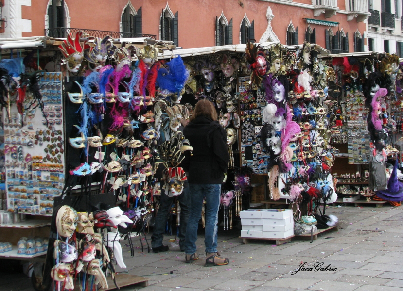 Čim kročis nogom na venecijansko kopno obuzme te ta karnevalska groznica.Nemaš masku, kostim ? Ništa za to … za nekoliko minuta naći ćes sve sto je potrebno za svačiji džep da se maskiraš od glave do pete.Tu je svileni plašt do zemlje u svim bojama i dezenima koji savršeno odgovara da se prebaci preko jakne, maska bela od 3 evra pa naviše, ona s drškom 10ak evra, šešir i kojekakve džakonije još pride,uključujući šarene konfete u velikim kesama za pola evra, te za 10ak do 30ak evra možes na bezbroj uličnih tezgi na Rivi degli Schiavoni da postaneš neko drugi, savršeno se uklapajući u celu atmosferu. Posle imaš sve te rekvizite kod kuće kao suvenir, a možda te neko kod kuće pozove i na maskenbal.Razume se, tu u prodavnicama u nizu ima i za dublji džep sve što je potrebno za jednu originalnu masku. Dakle, fešta za sve ! Tu su i štandovi sa šminkerima, pa se na pločniku možeš prepustiti mašti nekog umetnika koji će te maskirati senkama, olovkama, maskarama…Nošeni rekom ljudi, poštujemo i mi pravilo kretanja, te idemo desnom stranom, dok policajci regulišu pešački saobraćaj. Nedelja je, pola jedanaest, približavamo se Trgu Sv.Marka, zastajkujući ispred prodavnica, tezgi, fotkajuci maskirane i kostimirane …ne zna čovek gde da gleda, sve privlači pogled ! Sjajna atmosfera koja se teško može opisati rečima, već se mora doživeti !